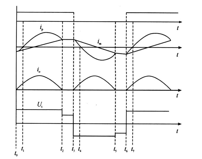 在下半個周期中, 電路的工作與上半個周期剛剛相似,只是方向相反。整個周期的電路工作波形:在上半個周期中,開關管Q1 為零電壓導通, 而Q1 在t3 時刻的關斷電流im 很??; 在下半個周期中,開關管Q2 為零電壓導通,而Q2 在t6 時刻的關斷電流im 很小,所以Q1 、Q2 工作時的開關損耗很小。