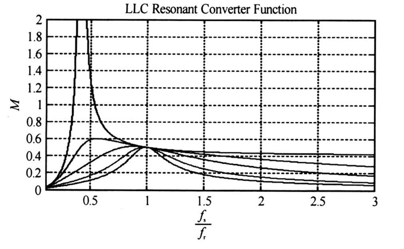 從圖3 中可以看到,在整個頻率圍內,既有降壓的工作區域(M < 1) ,也有升壓的工作區域( M >1) ,此LLC 諧振有著較大的應用范圍。 在輕負載時,工作頻率逐漸升高, 工作在降壓區域內; 而在重負載時, 工作頻率逐漸降低, 工作在升壓區域內。 由圖3 可知, 串聯諧振的工作區域應該為f s / f r > 1 ,才能工作在ZVS 的狀態。 在不同負載下,為獲得ZVS 的工作條件, 只要使之工作在f s / f r > 1的右側即可。 而LLC 諧振不僅僅局限于f s / f r > 1 的區域, 在某些負載下可以工作在f s / f r < 1區域。 同樣可以獲得零電壓轉換的工作狀況。 并且與串聯諧振相比,在不同負載時的頻率變化范圍更小。