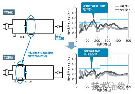 LED燈泡的輻射噪聲對策采用片式鐵氧體磁珠。該磁珠的位置不同,輻射噪聲的抑制效果也不同。