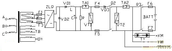 圖中VD3的作用是一個逆阻二極管,防止外部電源倒灌充電機。二極管后邊的開關就是充電機輸出開關。從這里出去的直流分為三路:一路去電池,一路去動力合閘母線,另一路為控制母線提供前級電源。