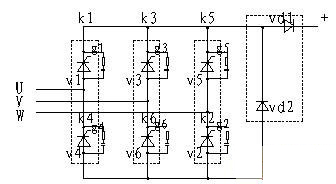 隨著現代集成技術的發(fā)展,功率大、體積小的可控硅模塊取代了原來的單元可控硅,一般一個橋臂是一個可控硅模塊,三個可控硅模塊組成一個三相全控橋,再加上一個有續(xù)流二極管和隔離二極管組成的二極管模塊,就組成了充電機的整流部分(見圖2),虛線框內表示為一個模塊。照下面的接線方式,可控硅的觸發(fā)順序為V1、V2、V3、V4、V5、V6。