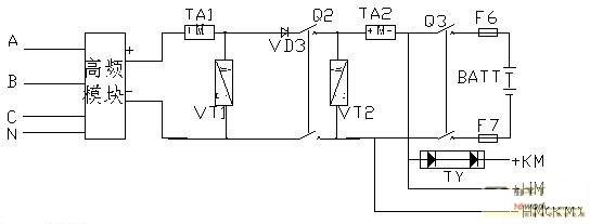 ⑴ 由于高頻模塊具有良好的輸入過欠壓和輸出過欠壓保護,而且具有良好的限流功能,因此,在輸入側和輸出側不需另加熔斷器保護。由于高頻模塊本身具有電壓電流顯示功能,而且監(jiān)控器也可以顯示系統(tǒng)中的其他參數,因此,在高頻系統(tǒng)中,相控系統(tǒng)中常用的表記也可以省略。