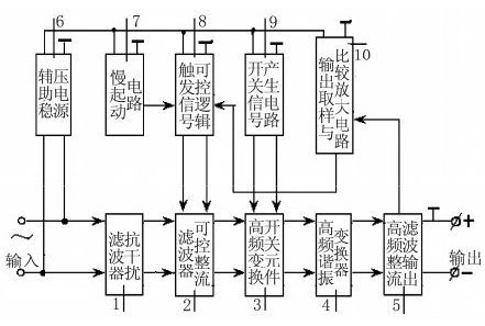 如圖1所示,它由抗干擾濾波器1、可控整流濾波器2、高頻變換開(kāi)關(guān)元件3、高頻諧振變換器4、高頻整流濾波輸出5依次連接而成。可控整流濾波器2的導(dǎo)通角的控制由觸發(fā)信號(hào)控制邏輯8完成。慢起動(dòng)電路7使觸發(fā)信號(hào)控制邏輯8在開(kāi)機(jī)時(shí)的導(dǎo)通角由零度逐步上升。輸出取樣與比較放大電路10,將高頻整流濾波輸出5的輸出電壓與基準(zhǔn)電壓源相比較且進(jìn)行放大,從而控制觸發(fā)信號(hào)控制邏輯8,使輸出電壓穩(wěn)定。改變基準(zhǔn)電壓源的大小,就能改變觸發(fā)信號(hào)控制邏輯8的觸發(fā)導(dǎo)通角,從而調(diào)節(jié)輸出電壓的大小。開(kāi)關(guān)信號(hào)產(chǎn)生電路9產(chǎn)生一個(gè)適合高頻諧振變換器4的方波信號(hào),用來(lái)控制高頻變換開(kāi)關(guān)元件3的導(dǎo)通和截止,使直流電能進(jìn)入高頻諧振變換器4,形成高頻電流震蕩;并經(jīng)高頻變壓器輸出至高頻整流濾波輸出5,減小了開(kāi)關(guān)噪聲。輔助穩(wěn)壓電源6給慢起動(dòng)電路7、觸發(fā)信號(hào)控制邏輯8、開(kāi)關(guān)信號(hào)產(chǎn)生電路9、輸出取樣與比較放大電路10提供能量和基準(zhǔn)電。