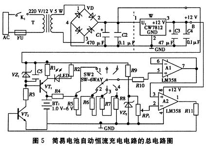 如圖4電路所示,自動斷電電路是由三極管VT2、電壓跟隨器A1、電壓比較器A2電阻R4、R5、R6、R7、R8、R11和可變電阻RP1構成。當充電開始時,電壓比較器輸出高電平,VT2導通,VT1也導通,指示燈發光二極管亮,給電池充電。可以先設定轉換開關為1時給一節電池充電,轉換開關為2時給二節電池充電,依次類推,實現對1-4節電池充電。當電充滿時,電壓比較器輸出低電平,VT2截止,VT1不導通,發光二極管熄滅,充電完畢。[page]