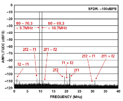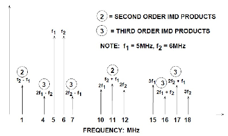 圖1:二階和三階交調積其中,f1 = 5 MHz, f2 = 6 MHz