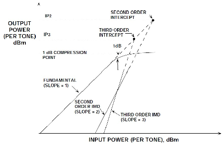 對于給定的頻率,在已知三階交調截點的情況下,可以計算出三階IMD積的近似電平值(為輸出信號電平的函數)。