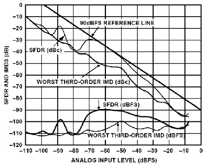 當輸入信號處于ADC滿量程范圍的幾dB之內時,IMD可能開始增加(但在設計優良的ADC中可能不會如此)。出現這種現象的確切電平取決于具體的ADC--有些ADC在其滿量程輸入范圍內,其IMD積不會顯著增大,但多數ADC會。當輸入信號繼續增加并超過滿量程范圍時,ADC應充當理想的限幅器,IMD積將變得非常大。出于對此類原因的考慮,ADC并無二階和三階IMD交調截點額定值。需要注意的是,DAC實際上存在同樣的情況。在兩種情況下,單音或多音SFDR(無雜散動態范圍)額定值是廣受認可的數據轉換器失真性能的衡量指標。
