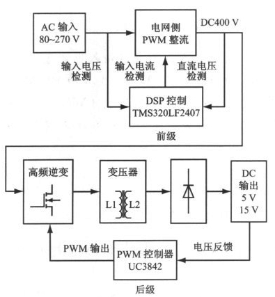 該種高功率因數開關電源設計方案采用PWM整流技術和DSP技術,能數字化地實現整流器網側單位功率因數正弦波電流控制,比較適合應用于中等功率開關電源設計中。