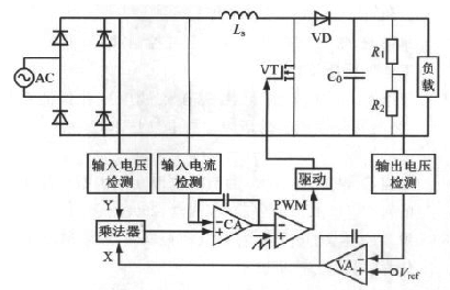 工作原理:APFC主電路的輸出電壓經電阻分壓后與基準電壓相比較,誤差值輸入到VA;VA 輸出信號X與輸入電壓檢測信號Y一起輸入乘法器,經過平均化處理、放大、比較后,再經過PWM 比較器加到柵極驅動器,產生對開關管VT的控制信號,從而使電感Ls上的電流(即輸入電流)平均值始終跟蹤模擬乘法器輸出的半正弦信號,即跟蹤了輸入電壓波形,并實現了輸入電流正弦化,使功率因數接近1,達到校正功率因數的目的。