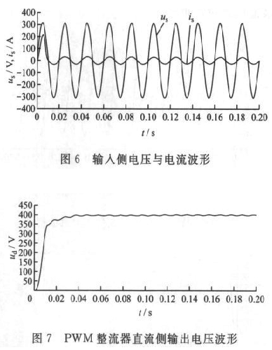 交流輸入側電壓與電流的仿真波形如圖6所示,可見交流側電流、電壓能始終保持同相,且電流能實現正弦化。直流側輸出電壓波形如圖7所示,可見0.06s后輸出電壓穩定在400V左右。
