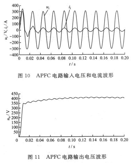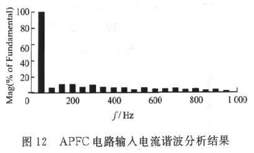 單相APFC電路采用Matlab7.6進行建模與仿真。圖10為APFC電路輸入電壓和電流波形,可見網側輸入電流由窄脈沖波形變成正弦電流波形,且與輸入電壓同相位。圖11為APFC電路輸出電壓波形,可見經過60ms的軟啟動過程之后,輸出電壓穩定在400V左右,滿足設計要求。圖12為APFC電路輸入電流諧波分析結果,可見除基波外,其余諧波含量均很小。