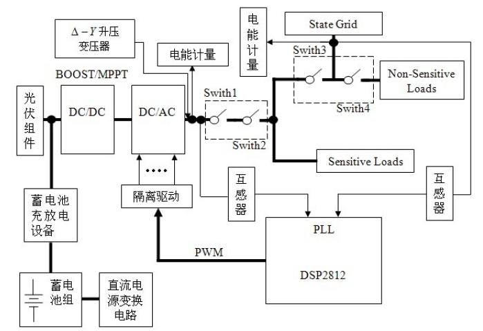 正常工作時,開關Switch1、Switch2、Switch3、Switch4 同時閉合,為當地負荷提供電能;當電網缺相、電壓嚴重跌落等非正常狀況時,由DSP 檢測出異常情況,做出判斷決策,并控制開關的開通與關斷。這時,開通Switch1 和Switch2,關斷Switch3,保證重要負荷的供電。當逆變器發生故障時,立即斷開Switch1,逆變器退出,同時斷開Switch4,由電網 對重要負荷供電。當逆變器故障消失時,再與電網同步后,開通Switch1,在閉合Switch4?;謴蛯Ξ數刎摵傻墓╇?。當需要檢修逆變器時,先斷開開 關Switch2,檢修完成后,重新閉合Switch2。