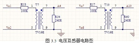 此系統輸出是三相交流電,輸出線電壓為380V,故選擇TV19E 電壓互感器,其輸出負載電阻可以接0~500 歐,輸出交流電壓0~2.5V,此系統采用240 歐的電阻,輸出電壓-1.2V~1.2V。滿足DSP 的輸入要求。電路如圖3.5 所示。