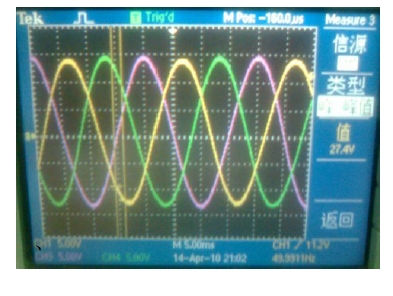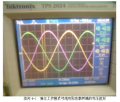 光伏并網發電系統要實現并網,必須使逆變輸出與電網電壓的幅度、相位與頻率達到一致,否則將會使電網諧波增加、電能質量下降,并產生并網環流,甚至造成光 伏發電系統的損壞。因此在并網過程中必須進行同步鎖相控制、輸出電壓幅度控制以滿足并網的要求。根據IEEE Std 1547-2003 規定最大相位誤差為20 度,瞬時電壓誤差不能超過電網電壓的10%、最大頻率誤差不能超過0.3Hz。圖片4-1為獨立工作模式時純電阻負載兩端的電壓波形。