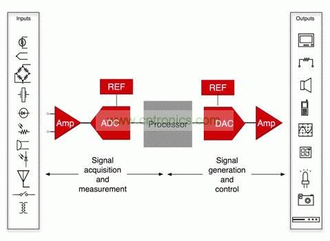 圖 1 所示結(jié)構(gòu)圖可代表信號處理的所有系統(tǒng)。如果它是一個(gè)測量或者數(shù)據(jù)采集系統(tǒng),則信號鏈開始于傳感器,經(jīng)過信號調(diào)節(jié)電路,進(jìn)入一個(gè) ADCr,然后結(jié)束于處理器。如果它是一個(gè)控制系統(tǒng)、一個(gè)音頻處理系統(tǒng)亦或是一個(gè)軟件定義無線電設(shè)備則可能存在一些必須變回到模擬信號的處理器輸出;這種情況顯示在結(jié)構(gòu)圖的右手側(cè)二分之一處。