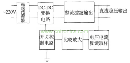 開關(guān)直流穩(wěn)壓電源是基于方波電壓的平均值與其占空比成正比以及電感、電容電路的積分特性而形成的。其基本工作原理是,先對(duì)輸入交流電壓整流,從而形成脈動(dòng)直流電壓,經(jīng)過DC-DC 變換電路變壓,再通過斬波電路形成了不同脈沖寬度的高頻交流電,然后對(duì)其整流濾波輸出需要電壓電流波形。如果輸出電壓波形偏離所需值,便有電流或電壓采樣電路進(jìn)行取樣反饋,經(jīng)過與比較電路的電壓值進(jìn)行參數(shù)比較,把差值信號(hào)放大,從而控制開關(guān)電路的脈沖頻率f 和占空比D,以此來控制輸出端的導(dǎo)通狀態(tài)。因此,輸出端便可以得到所需的電壓電流值。