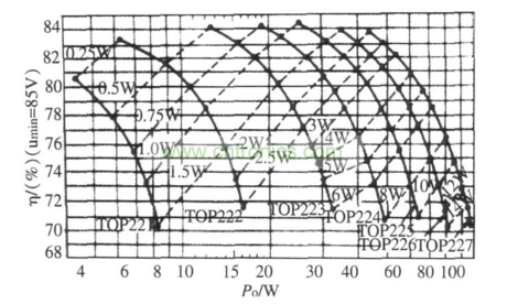 例如,設(shè)計(jì)輸出5 V, 30 W 的通用開關(guān)電源時(shí),就要選擇圖3.因?yàn)橥ㄓ瞄_關(guān)電源輸入交流電壓范圍85~ 265 V.首先從橫坐標(biāo)上找到Po = 30 W 的輸出功率點(diǎn),然后垂直上移,與T OP224 的實(shí)線相交于一點(diǎn),由縱坐標(biāo)上查出該點(diǎn)的η= 71.2%,最后從經(jīng)過這點(diǎn)的那條等值線上,查得PD = 2.5 W.這表明,選擇TOP224 就能輸出30 W 功率,并且預(yù)期的電源效率為71.2%,芯片功耗為2.5 W.如果覺得指標(biāo)效率偏低,還可以繼續(xù)往上查TOP225 的實(shí)線。同理,選擇TOP225 也能輸出30 W 的功率,而預(yù)期的電源效率可以提高到75%,芯片功耗可以降低1.7 W.然后根據(jù)所得到的PD 值,還可以進(jìn)而完成散熱片設(shè)計(jì)。