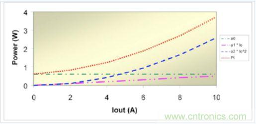 如果意識到電源損耗與輸出電流相關(guān)(可用輸出電流替換 X),那么系數(shù)項就能很好地與不同來源的電源功率損耗聯(lián)系起來。例如,ao 代表諸如柵極驅(qū)動、偏壓電源和磁芯的固定開銷損耗以及功率晶體管 Coss 充電與放電之類的損耗。這些損耗與輸出電流無關(guān)。第二項相關(guān)聯(lián)的損耗 a1 直接與輸出電流相關(guān),其典型表現(xiàn)為輸出二極管損耗和開關(guān)損耗。在輸出二極管中,大多數(shù)損耗是由于結(jié)電壓引起的,因此損耗會隨著輸出電流成比例地增加。
