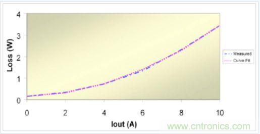 實際損耗與三項式之間的相關(guān)性非常好。圖 2 對同步降壓穩(wěn)壓器的測量數(shù)據(jù)與曲線擬合數(shù)據(jù)進(jìn)行了對比。我們知道,在基于求解三個聯(lián)立方程組的曲線上將存在三個重合點。對于曲線的剩余部分,兩個曲線之間的差異小于2%。由于工作模式(如連續(xù)或非連續(xù))不同、脈沖跳頻或變頻運行等原因,其他類型的電源可能很難以如此匹配。這種方法并非絕對可靠,但是有助于電源設(shè)計人員理解實際電路損耗情況。