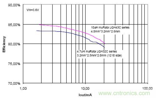 圖 10 顯示整個鋰離子電池電壓范圍(2.7V~4.2V)內(nèi)均可以實(shí)現(xiàn) 80% 以上的效率。在此應(yīng)用中,使用了一個高度僅為 1.2mm 的電感 (Sumida CMD4D11-4R7, 3.5mm*5.3mm*1.2mm)。 從圖 10 中的效率曲線可以看出:在大多數(shù)應(yīng)用中,升壓轉(zhuǎn)換器可以實(shí)現(xiàn)比充電泵解決方案更高的效率。但是,在無線應(yīng)用中使用升壓轉(zhuǎn)換器或充電泵時(shí)還需要考慮 EMI 問題。