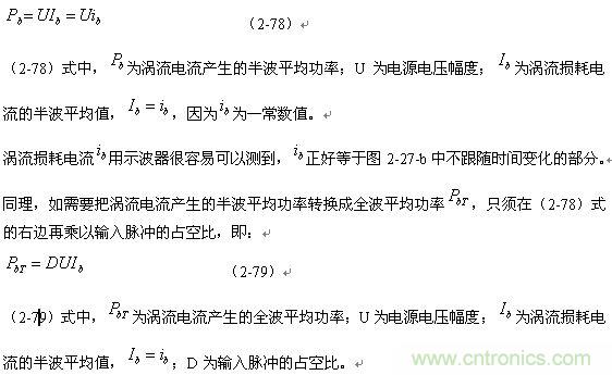 順便指出:(2-79)式的結果,是認為渦流損耗在t1-t2期間(圖2-27-b)完全等于0而求得的,但實際上,在t1-t2期間變壓器初級線圈產生的反電動勢同樣也會在變壓器鐵芯中感應產生渦流損耗電流,即當輸入電壓為0時刻,在變壓器鐵芯中還存在很短暫時間的渦流損耗;由于這種渦流損耗是由反電動勢提供能量來維持的,它將隨著反電動勢能量的衰減很快就衰減到0。