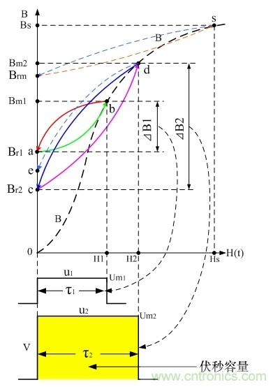 圖9是開關變壓器伏秒容量與磁場強度H、磁感應強度B的對應關系圖。圖中,脈沖幅度V總是與磁感應強度的增量