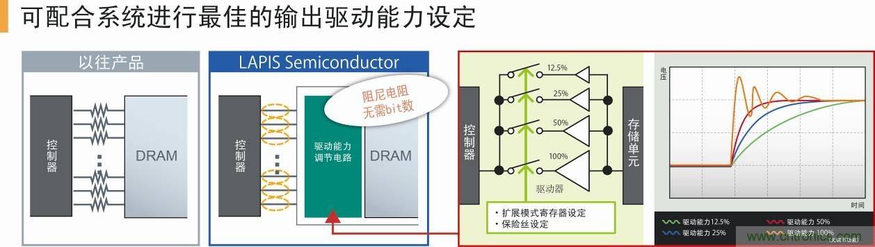本功能有助于實現(xiàn)適合用戶系統(tǒng)的電流驅(qū)動能力優(yōu)化、降低輻射噪聲、減少輻射噪聲對策零部件數(shù)量。另外,可按出貨時固定規(guī)格的驅(qū)動能力設定供貨,即使使用已有的SDRAM控制器無需配置擴展模式寄存器,即可使用最佳的輸出驅(qū)動能力設定的產(chǎn)品。