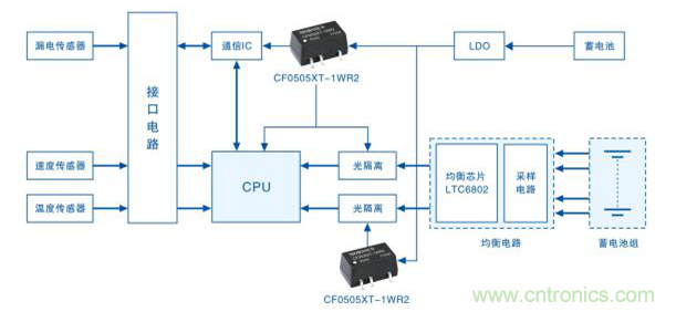 針對汽車行業的高可靠要求,以及BMS在整車系統中的“心臟”作用,金升陽率先推出全球范圍內汽車級DC_DC電源模塊CF0505XT-1WR2,填補了電源行業在BMS電源方面的空白,該系列產品具有以下特點: