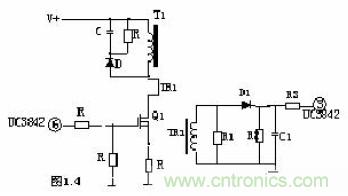 當輸出U0降低時,U1③腳電壓降低,當其低過U1②腳基準電壓后U1①腳輸出低電平,Q1不導通,光耦OT1發(fā)光二極管不發(fā)光,光電三極管不導通,UC3842①腳電位升高,從而改變U1⑥腳輸出占空比增大,U0降低。周而復始,從而使輸出電壓保持穩(wěn)定。調(diào)節(jié)VR1可改變輸出電壓值。