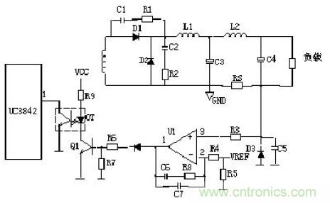 R4、C3、R5、R6、C4、D1、D2組成緩沖器,和開關(guān)MOS管并接,使開關(guān)管電壓應力減少,EMI減少,不發(fā)生二次擊穿。在開關(guān)管Q1關(guān)斷時,變壓器的原邊線圈易產(chǎn)生尖峰電壓和尖峰電流,這些元件組合一起,能很好地吸收尖峰電壓和電流。從R3測得的電流峰值信號參與當前工作周波的占空比控制,因此是當前工作周波的電流限制。當R5上的電壓達到1V時,UC3842停止工作,開關(guān)管Q1立即關(guān)斷。