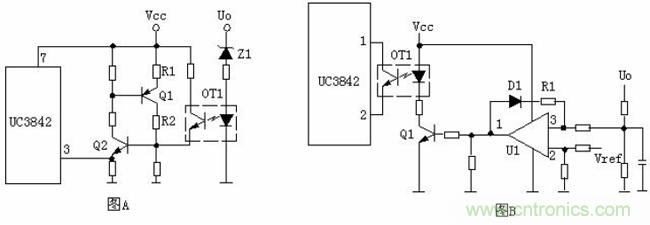 圖A的工作原理是,當輸出電壓Uo升高,穩(wěn)壓管導通,光耦導通,Q2基極得電導通,由于Q2的導通Q1基極電壓降低也導通,Vcc電壓經(jīng)R1、Q1、R2使Q2始終導通,UC3842③腳始終是高電平而停止工作。在圖B中,UO升高U1③腳電壓升高,①腳輸出高電平,由于D1、R1的存在,U1①腳始終輸出高電平Q1始終導通,UC3842①腳始終是低電平而停止工作。正反饋?