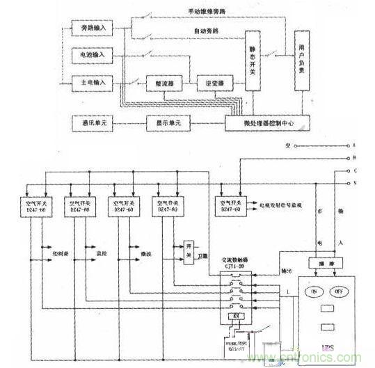 解決UPS短暫斷電問題,對(duì)其進(jìn)行了技術(shù)改造,新增UPS電源供電,并對(duì)原有供電系統(tǒng)的控制部分進(jìn)行升級(jí)。新增UPS電源為 美國(guó)山特CASTLE系列C3K型在線式不間斷電源。在線式UPS的運(yùn)作模式為市電和用電設(shè)備是隔離的,市電不會(huì)直接供電給用電設(shè)備,而是通過UPS轉(zhuǎn)換 成直流電,再兵分兩路,一路為電池充電,另一路則轉(zhuǎn)回交流電,供電給用電設(shè)備,市電供電品質(zhì)不穩(wěn)或停電時(shí),電池從充電轉(zhuǎn)為供電,直到市電恢復(fù)正常才轉(zhuǎn)回充 電,UPS在用電的整個(gè)過程是全程介入的。