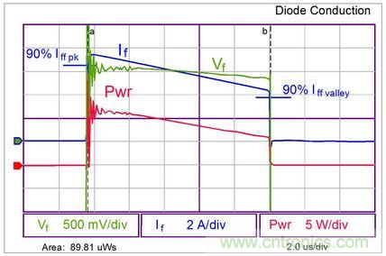 必須獲取在開關周期的部分時段(此時電流為無功模式使二極管導電)時的二極管導通損耗資料。通常量測峰值、負及反向導電電流10%點的資料。