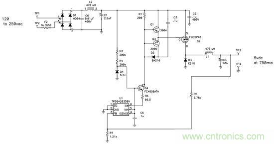 PMP5412 — 120VAC-250VAC 輸入、5V/0.75A 無變壓器偏置電源
