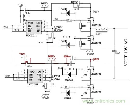 可以濾除載波頻率。考慮到MOS管需要相對(duì)較小的導(dǎo)通電阻RDS(on)和較小上升時(shí)間和下降時(shí)間的,本系統(tǒng)選用CSD19506。本系統(tǒng)需要驅(qū)動(dòng)全橋,為了提高M(jìn)OSFET的導(dǎo)通速度,降低開關(guān)損耗,因而選用TI提供的高速半橋驅(qū)動(dòng)芯片UCC27211。圖2是全橋部分電路圖。