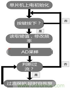 軟件結(jié)構(gòu)框圖如圖1,主程序框圖如圖3。程序執(zhí)行的流程如下所述:?jiǎn)纹瑱C(jī)上電之后,系統(tǒng)進(jìn)行按鍵、片上ADC12和LCD顯示屏初始化,程序查詢按鍵,若有相應(yīng)按鍵按下,修改正弦波頻率,然后AD采樣電流判斷是否過流;否則返回繼續(xù)查詢按鍵。如果輸出過流,程序?qū)㈥P(guān)閉SPWM輸出,延時(shí)自恢復(fù);否則返回按鍵查詢。