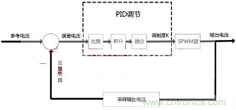 由于輸入電壓隨著負(fù)載變大會(huì)有降低,切系統(tǒng)濾波電感具有電阻成分,這些因素導(dǎo)致在系統(tǒng)開環(huán)下負(fù)載調(diào)整率較大,因此本系統(tǒng)采用閉環(huán)反饋調(diào)整輸出電壓穩(wěn)定在10V。我們選用經(jīng)典PID反饋調(diào)整,對(duì)輸出電壓進(jìn)行采樣,與參考電壓比較得到誤差電壓后進(jìn)行位移式PID調(diào)節(jié),PID運(yùn)算輸出作為SPWM的調(diào)制度K,與正弦波表相乘后形成新的波表進(jìn)行生成SPWM波運(yùn)算。用此方法后負(fù)載調(diào)整率降到了1%以下,圖5是反饋過程框圖。
