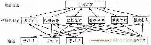我們采用自頂向下的設計方式,將系統分為3層:主界面層、邏輯功能層和底層。“主界面層”主要包括主人機界面和系統總體控制。“邏輯功能層”負責系統的各種邏輯功能,例如I/O設置、數據采集、數據處理、數據管理和數據查詢等。“底層”則是一個個按照基本功能劃分子VI,供給高層次VI調用。采用調用子VI的形式來實現模塊之間的調用和關聯。當調用子VI時,系統需要花費很少的開銷,大概幾十毫秒的時間。測試系統的軟件層次結構圖3所示。