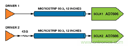 在圖7 中,一個驅動器通過一條12 英寸的微帶線路連接SCLK1,另一個驅動器通過一個與微帶串聯的43 Ω 電阻連接SCLK2。