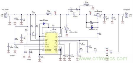 SEPIC擁有兩個開關節點(TP2、TP3),而不是單個升壓的開關節點。SEPIC同步場效應晶體管(FET)(Q1)的柵極不能直接連接到升壓型控制器的高側驅動器,因為它的源極(TP3)與它的SW引腳(TP2)不在同一電位。為了驅動它,筆者添加了一個由R3/D2/C15構成的浮動電平移位器電路。C15具有跨越其兩端的VIN的電壓降,這與“快速”電容器C1的電壓相同,從而能提供跨Q1柵極至源極的正確電壓擺幅。R3/D2可恢復正確的柵極驅動器偏移量(低 = - 0.5V,高 = 7V)。