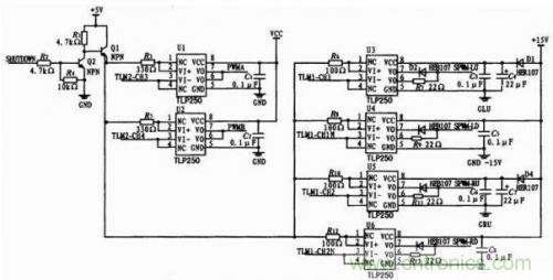 選用東芝半導(dǎo)體公司生產(chǎn)的高速光耦隔離型IGBT/MOSFET驅(qū)動芯片TLP250.TLP250具有隔離電壓高、驅(qū)動能力強、開關(guān)速度快等特點。驅(qū)動電路的原理圖如圖3所示。