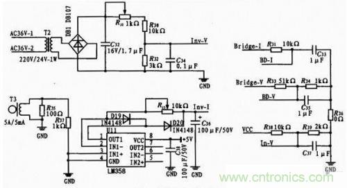 對于輸出電流取樣,本設(shè)計中使用了5 A/5 mA電流互感器。由于電流互感器的輸出為毫伏級的交流信號,為了能夠被單片機內(nèi)部AD模塊采集到,必須將其整流成直流信號并加以放大。而普通二極管整流電路對毫伏級電壓是無效的,因此,此處采用了由運算放大器(U11,LM3 58)構(gòu)成的小電壓整流電路。實際測試表明,該電路有效解決了毫伏級信號的采樣問題。