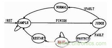 為了提高系統(tǒng)的可讀性以及代碼效率,軟件采用狀態(tài)機思想設(shè)計,圖5所示為系統(tǒng)的狀態(tài)轉(zhuǎn)換圖。系統(tǒng)上電復(fù)位后進(jìn)入SAMPLE采樣狀態(tài),若檢測到采樣完成標(biāo)志FINISH則進(jìn)入JUDGE狀態(tài)進(jìn)行判斷,如果FAULT不為0即有故障信號(過壓/欠壓、過載、短路),則進(jìn)入PROTECT狀態(tài)關(guān)閉輸出,并跳轉(zhuǎn)到WAIT狀態(tài)等待故障信號消除。當(dāng)故障信號消除后,系統(tǒng)軟重啟,開始新的采樣及檢測。JUDGE狀態(tài)后如果未檢測到故障信號,則進(jìn)入NORMAL正常狀態(tài),進(jìn)行電壓調(diào)整。