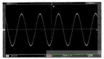 根據(jù)以上思想試制一臺400 W的樣機,采用IRF3205作為推挽升壓的功率管,HER307作為整流二極管,全橋逆變功率管則采用IRF840.前級升壓的PWM波頻率設(shè)置為20 kHz,后級SPWM波的頻率設(shè)置為18 kHz,輸出濾波電感L為1 mH,輸出濾波電容C為4.7μF.實際測試正弦交流輸出電壓精度為220 V±1%,頻率精度為50 Hz±0.1%,THD小于1.5%,逆變效率大于87%,其滿負(fù)載時的試驗波形如圖7所示(輸出經(jīng)20 kΩ/100 kΩ電阻分壓測到)。