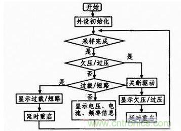 系統(tǒng)上電后,首先完成各個外設(shè)的初始化,主要包括系統(tǒng)時鐘、定時器、GPIO口、ADC、DMA、中斷及SPI的初始化。在此,定時器和中斷一旦初始化完成,PWM及SPWM波就會生成。考慮到過流、短路保護及反饋穩(wěn)壓的實時性要求較高,故在中斷內(nèi)完成。欠壓、過壓對實時性要求低,放在主程序內(nèi)。為提升系統(tǒng)的性能,ADC采樣使用DMA方式傳輸數(shù)據(jù),傳輸完成后,發(fā)出中斷申請,對采集到的數(shù)據(jù)進(jìn)行簡單濾波處理,其他功能函數(shù)調(diào)用此數(shù)據(jù)完成相應(yīng)的保護及穩(wěn)壓功能。主程序的流程圖如圖6所示。