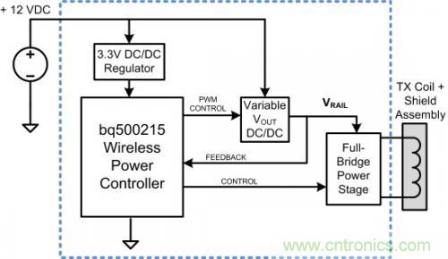 10W發射器系統運行在固定頻率下,但是卻使用一個可調前置穩壓器來改變用于線圈激勵的直流電壓軌。一個全橋電路被用來生成用于TX線圈的交流激勵電流。圖2中顯示的是一個定頻(10W)無線充電發射器系統的基本方框圖。當RX需要更多的輸出功率時,直流電壓軌為TX線圈功率級提供的電壓會增加。直流電壓隨著RX負載的下降而減少。