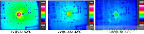bq51025 10W無線接收器輸出電壓可在5V至10V的范圍內用外部反饋電阻器進行調節。這樣就可實現對一節或兩節串聯電池配置的充電,并且在與一個寬輸入電壓范圍開關模式NVDC類型充電器組合在一起時,能夠保持單節電池充電情況下的高效率。在諸如無線RX輸出情況下,NVDC充電器架構在減少較高電壓電源所需的輸入電流的同時,可實現低壓電池的高效充電。圖3顯示的是無線接收器電路板在為負載提供一個10W電源的同時,在5V,7V和10V輸出設置下的熱響應(分別為圖。 3a,b和c)。很明顯,10V輸出情況下產生的熱量最少,應該在高頻開關模式充電器可用于電池充電的情況下使用。