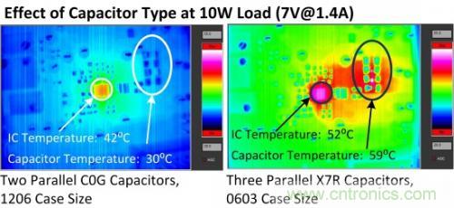 在使用C0G(較大封裝,低串聯等效電阻(ESR))和X7R(較小封裝,較高ESR)時的熱性能差異是十分可觀的(圖5)。