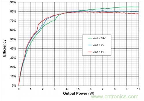 圖6.在5V,7V和10V輸出設置時,10W電源系統的端到端效率