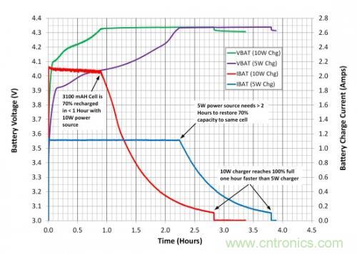 最后,執行一個10W無線電源系統的原因是減少高容量電池的充電時間。圖8顯示了與bq24261 NVDC開關模式充電器組合使用時,使用5W和10W無線電源系統時針對3.1Ah鋰離子電池的充電時間。充電時間被大幅減少—從使用5W充電器時接近4個小時減少到使用10W充電器時的少于3小時。由于鋰離子電池充電算法的逐漸降低“漸止”屬性,總充電時間的減少值與提供的電源不直接成比例。然而,代表滿充電狀態大約70%的恒定電流到恒定電壓模式的轉換點減小到了原來的一半(圖8)。